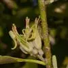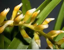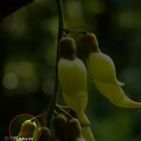 花被长2-3厘米,基部膨大呈球形,直径达6毫米,向上收狭呈一长管,管长约1.4厘米,绿色,外面无毛,内面具腺体状毛,管口扩大呈漏斗状;檐部一侧极短,有时边缘下翻或稍二裂,另一侧渐扩大成舌片;舌片卵状披针形,顶端长渐尖具延伸成1-3厘米线形而弯扭的尾尖,黄绿色,常具紫色纵脉和网纹;花药长圆形,贴生于合蕊柱近基部,并单个与其裂片对生;