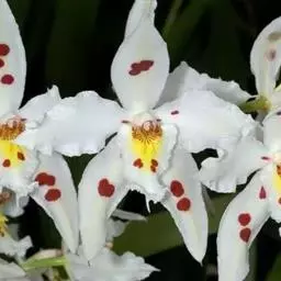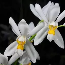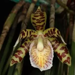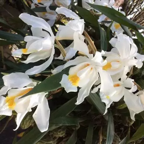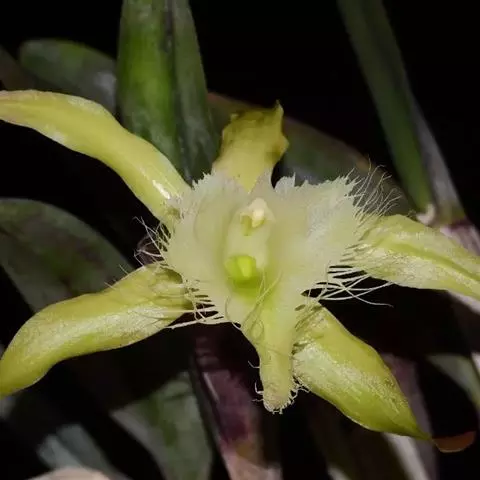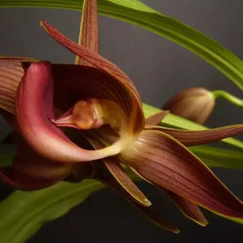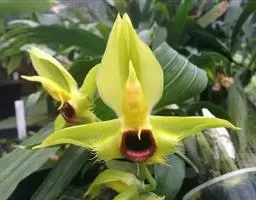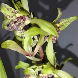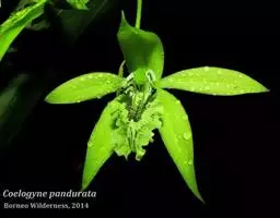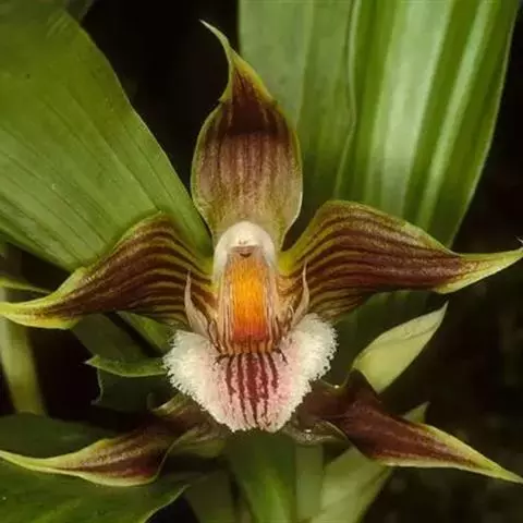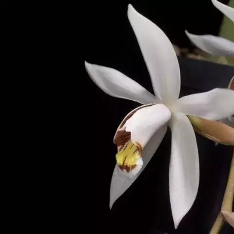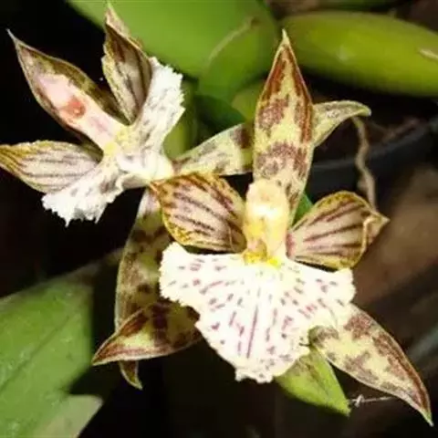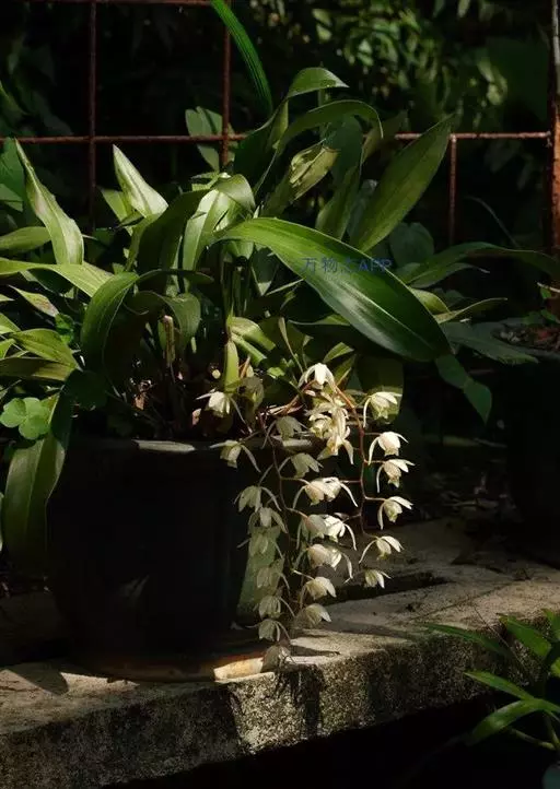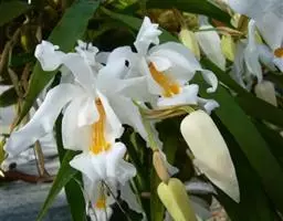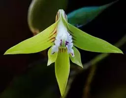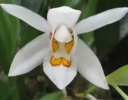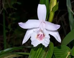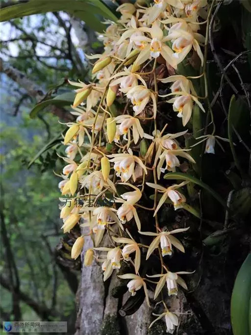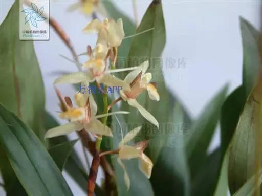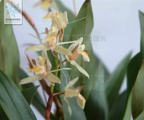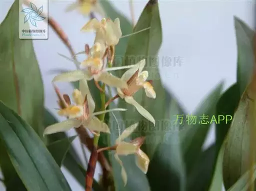 栗鳞贝母兰(学名:Coelogyne flaccida Lindl.):根状茎粗壮,坚硬,粗7-8毫米,密被紫褐色的革质鞘。假鳞茎在根状茎上通常相距2-3厘米,长圆形或近圆柱形,向顶端稍变狭,顶端生2枚叶。叶革质,长圆状披针形至椭圆状披针形。花葶连同幼嫩的假鳞茎和叶从靠近老假鳞基部的根状茎上发出;总状花序长11-21厘米,疏生8-10朵花;花浅黄色至白色,唇瓣上有黄色和浅褐色斑;花瓣线状披针形,略短于萼片,宽2-3毫米;唇瓣近卵形,长1.6-2厘米,宽约1.5厘米,3裂。花期3月。
