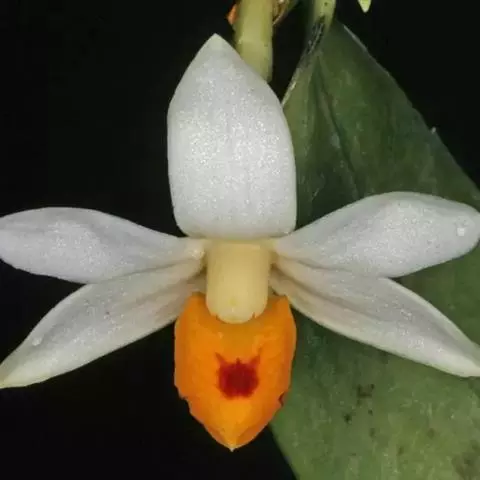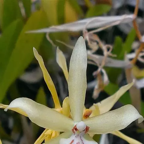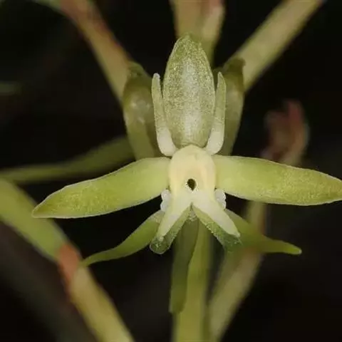 花葶连同幼嫩的假鳞茎和叶从靠近老假鳞基部的根状茎上发出,长16-32厘米,下半部为鞘所包;总状花序长11-21厘米,疏生8-10朵花;花苞片倒卵状椭圆形,长约2.5厘米,早落;花梗和子房长1.7-2厘米;花浅黄色至白色,唇瓣上有黄色和浅褐色斑;中萼片长圆形或长圆状披针形,长2.1-2.4厘米,宽6-7毫米;侧萼片稍狭,背面多少有龙骨状脊。