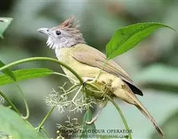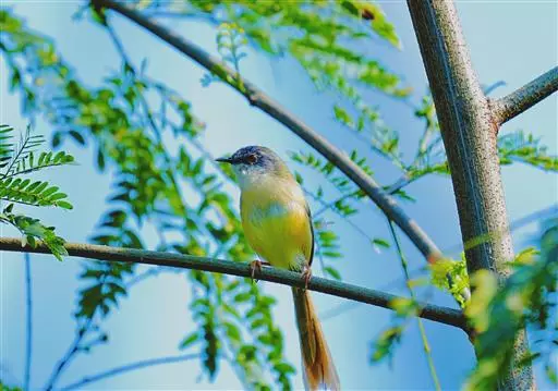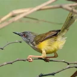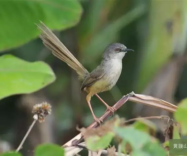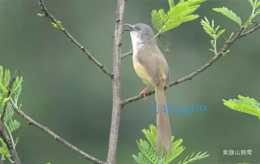 黄腹鹪莺(学名:Prinia flaviventris):体长13厘米,是一种体型略大而尾长的橄榄绿色鹪莺。喉及胸白色,以下胸及腹部黄色为其特征。头灰,有时具浅淡近白的短眉纹;上体橄榄绿色;腿部皮黄或棕色。换羽导致羽色有异。繁殖期尾较短,雄鸟上背近黑色较多,雌鸟碳黑色;冬季粉灰。虹膜浅褐色,上嘴黑色至褐色,下嘴浅色,脚橘黄色。