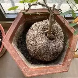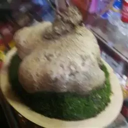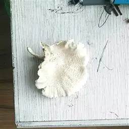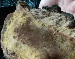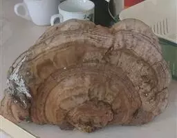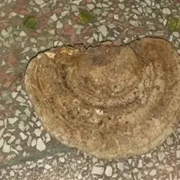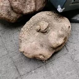 本品为不规则的块状,直径2~7cm,厚0.2~1.5cm。外皮暗褐色,有皱纹及须根痕。切面类白色或灰白色,可见筋脉纹(维管束),有的略呈环状排列。质硬而脆,易折断,断面显粉性。
