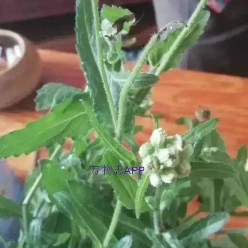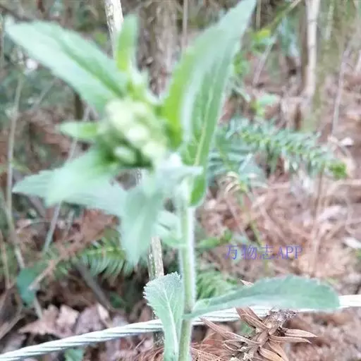叶通常密集于茎较下部,呈莲座状,基部叶倒卵形或匙形,顶端圆形,基部长渐狭,长6-7厘米,较下部叶有长柄,长3-13厘米,叶片长圆形或椭圆状长圆形,或倒披针形,顶端圆形,基部楔形,常下延成具宽翅的柄,边缘有圆齿或粗锯齿,有4-5对侧脉,在下面明显,两面被白色长柔毛;中部叶疏生,倒披针状长圆形或长圆状披针形,无柄,长3.5-5厘米,宽5-15毫米,顶端钝,基部宽而半抱茎,边缘有小尖齿,上部叶渐小,披针形或线状披针形,两面被长贴毛。