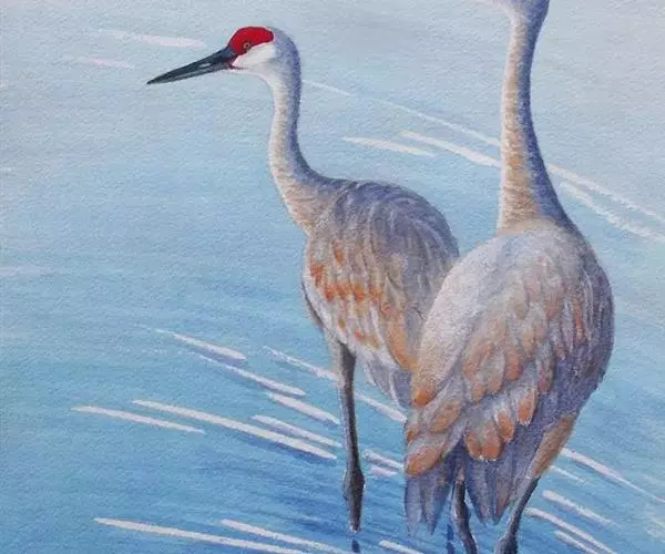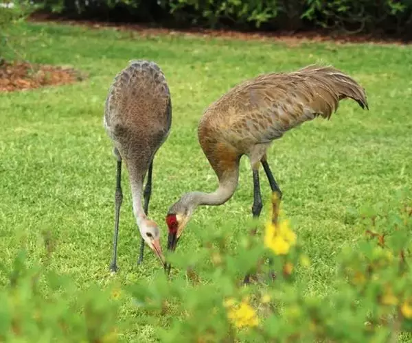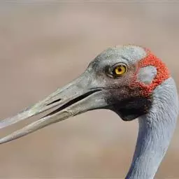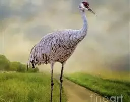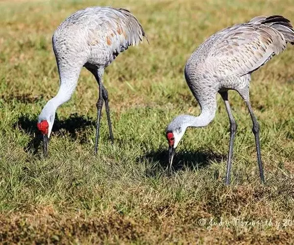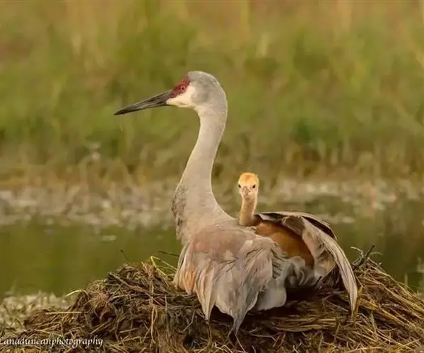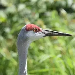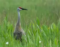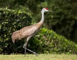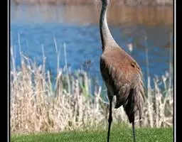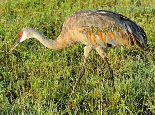 沙丘鹤又叫棕鹤或加拿大鹤,是大型涉禽,体长100-110厘米。通体的羽色均为灰色而缀有褐色,下体稍淡。前额、眼先和头顶的前部都有裸露的皮肤,呈鲜红色,被有稀疏的象头发一样的刚毛。颏部和喉部为白色。初级飞羽为11枚,第三枚最长,飞羽的内 为黑褐色,三级飞羽延长成弓状,羽端的羽枝分离,覆盖在尾羽上。尾羽为12枚,短而直。长腿几乎为黑色。脸偏白,额及顶冠红色,飞行时可见深灰色的飞羽。虹膜黄色;嘴灰色;脚灰色。
