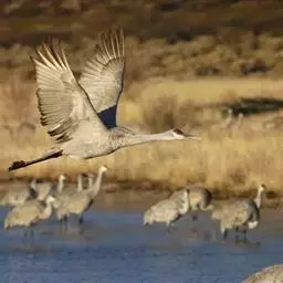 沙丘鹤(学名:Grus canadensis)为鹤科鹤属的鸟类。该物种的模式产地在加拿大哈得逊湾。沙丘鹤又叫棕鹤或加拿大鹤,是大型涉禽,体长100-110厘米。通体的羽色均为灰色而缀有褐色,下体稍淡。前额、眼先和头顶的前部都有裸露的皮肤,呈鲜红色,被有稀疏的象头发一样的刚毛。颏部和喉部为白色。长腿几乎为黑色。主要以各种灌木和草本植物的叶、芽、草籽和谷粒等为食。中国国家二级重点保护野生动物。