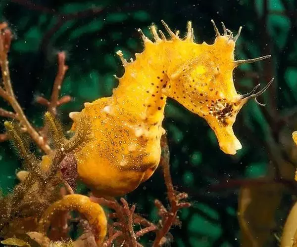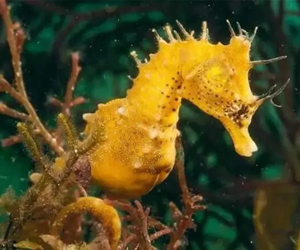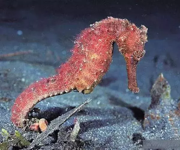 大海马体形粗壮,体长12一23.5cm,腹部较膨大、头较大,近似直角。小棘发达,吻呈管状较粗大,体色较黑。