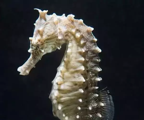 海马的外部形态,各种之间大同小异。斑海马体长一般为10- 17cm。体侧扁,头部似马头,腹部明显突出。躯干呈七棱形,尾部呈四棱形,尾较长渐细并向腹面卷曲,用以卷住海藻等作栖息用。吻细长,呈管状,口甚小,位于近头侧背方。头与驱干部成直角。海马全身无鳞片,完全由骨环所包被。鱼体一般呈褐色,但随栖息环境的变化,体色可随之发生变化并与环境趋于一致。体侧第1、4、7体环的背方各有一黑色圆斑,故称三斑海马,这是分辨本种的主要特征。雄鱼尾部腹面具有1个特殊的袋状器官- 育儿袋。