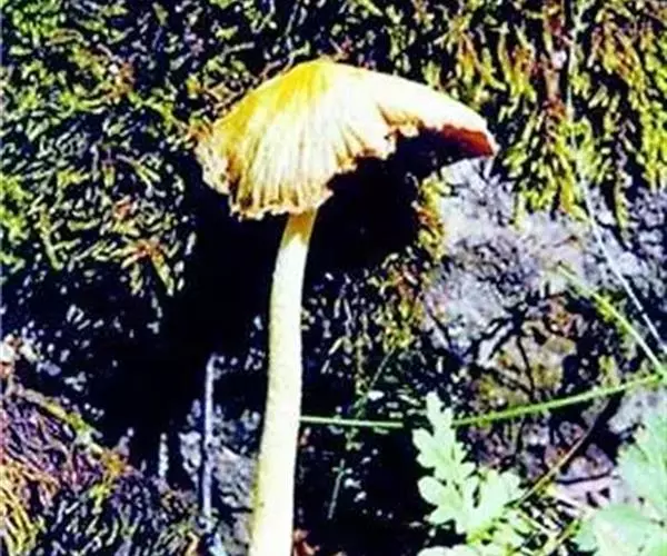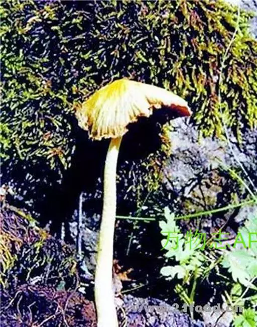 粪锈伞Bolbitius vitellinus(Pers.)Fr.的子实体一般较小。菌盖近钟形,半膜质,表面粘,光滑,中部淡黄色或柠檬黄色,有皱纹,向边缘渐变为米黄色,直径2-4.5cm,边缘有细长条棱,可接近顶部。菌肉很薄。菌褶近弯生,密或稍稀,窄,深肉桂色,褶沿色淡。菌柄细长,柱形,长5-10cm,粗0.2-0.3cm,质脆,有透明感,光滑或上部有白色细粉粒,污黄白色,空心,基部稍许膨大。