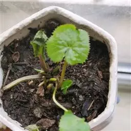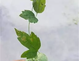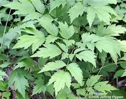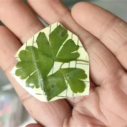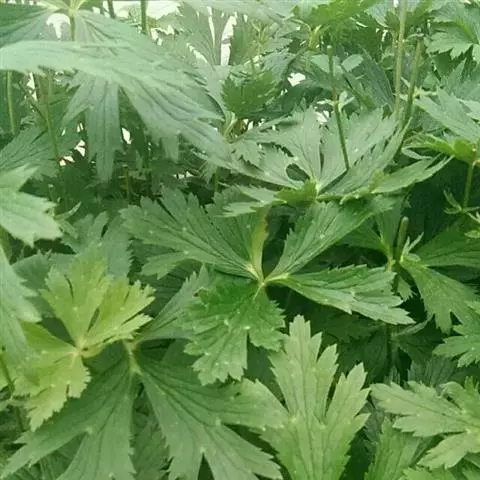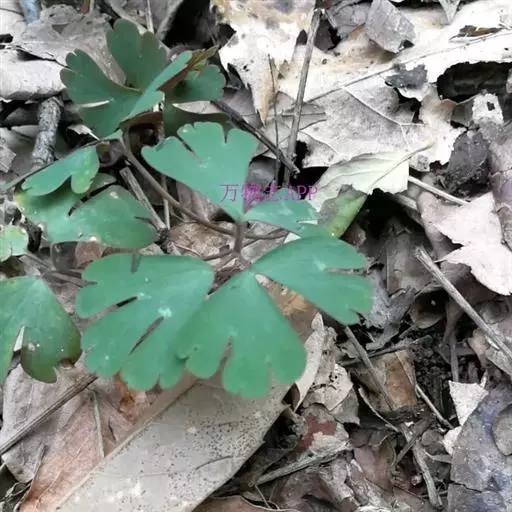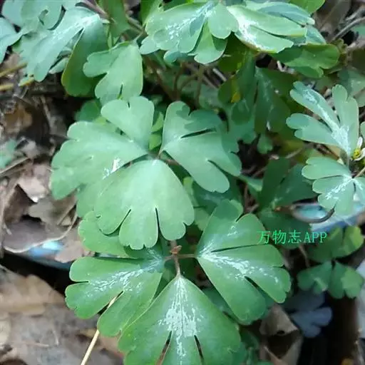 基生叶多数,为掌状三出复叶;叶片轮廓卵圆形至肾形,长1.2-3厘米;小叶扇状菱形或倒卵状菱形,长0.6-2.5厘米,宽1-2.8厘米,三深裂,深裂片又有2-3个小裂片,两面均无毛;叶柄长3-12厘米,基部扩大呈鞘状。茎生叶与基生叶相似,惟较小。