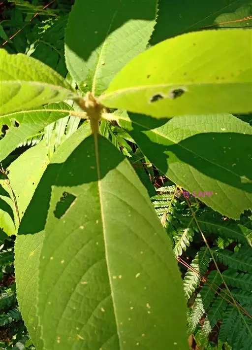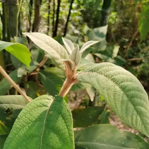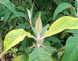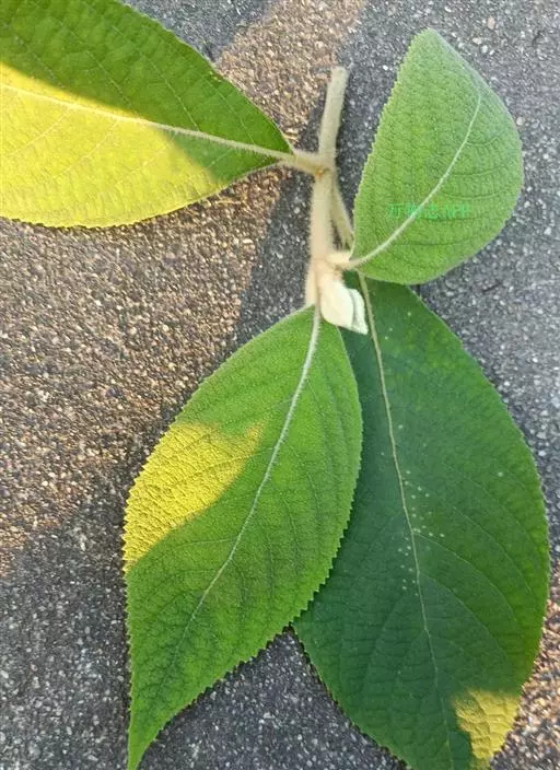 叶片长椭圆形、卵状椭圆形或长椭圆状披针形,长12-22厘米,宽4-8厘米,顶端渐尖或锐尖,基部楔形,边缘有锯齿,表面无毛或疏被毛,通常脉上较密,背面密生黄褐色星状毛和分枝茸毛,两面被不明显的黄色腺点,侧脉10-18对,在叶背隆起;叶柄长1-3厘米。