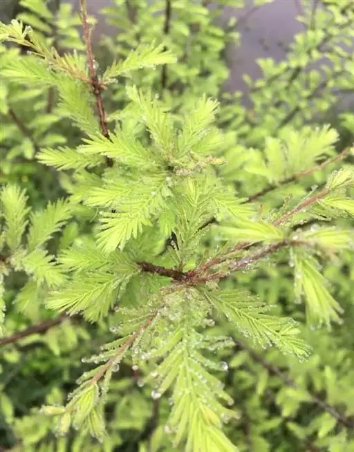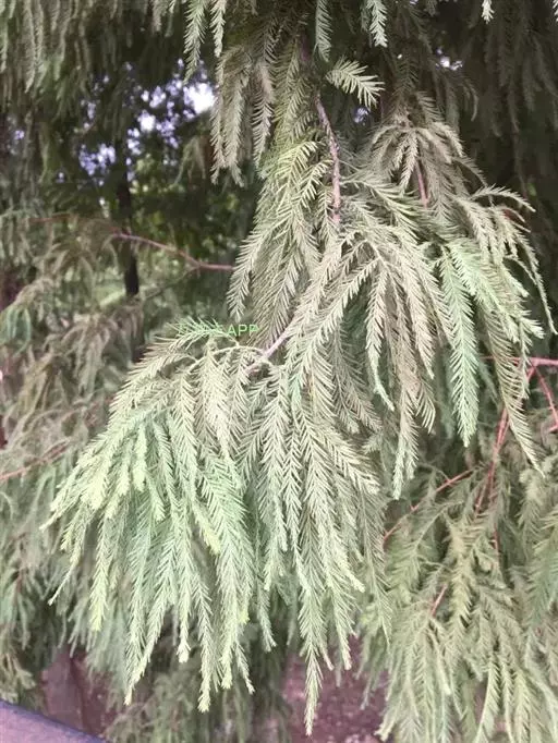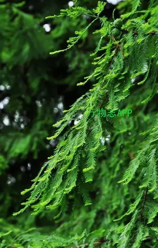 半常绿或常绿乔木,在原产地高达50米,胸径可达4米;树干尖削度大,基部膨大;树皮裂成长条片脱落;枝条水平开展,形成宽圆锥形树冠,大树的小枝微下垂;生叶的侧生小枝螺旋状散生,不呈二列。叶条形,扁平,排列紧密,列成二列,呈羽状,通常在一个平面上,长约1厘米,宽1毫米,向上逐渐变短。雄球花卵圆形,近无梗,组成圆锥花序状。球果卵圆形。