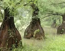 落羽杉 Rich.),杉科落羽杉属木本植物。树干尖削度大,基部通常膨大,具膝状呼吸根,树皮棕色,…