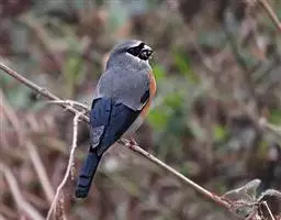 雌鸟和雄鸟大致相似,但头部黑色较暗淡少光泽,背灰色沾褐,下背微沾棕,下体不为红色而为褐灰色微沾红色,其余似雄鸟。