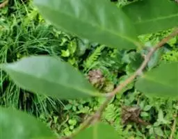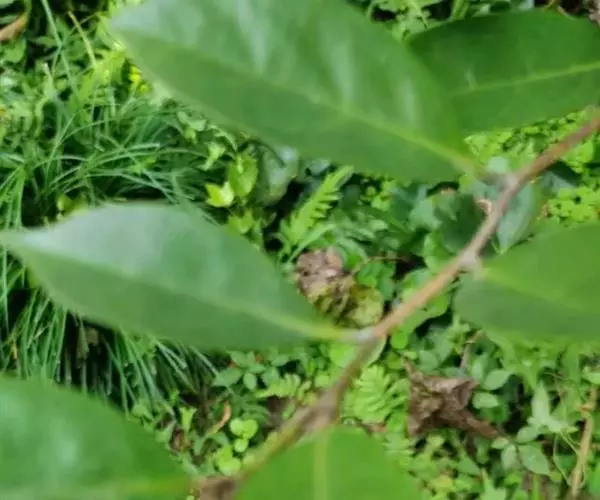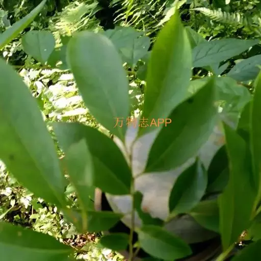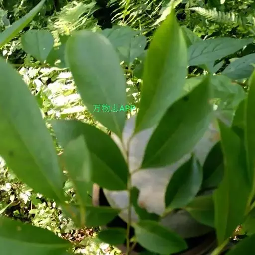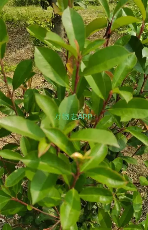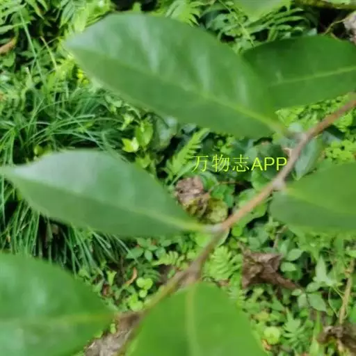 叶薄革质,长椭圆形或下部的为卵形,长5-10厘米,宽2.5-4厘米,先端短渐尖或钝,基部楔形,叶缘微背卷,上面有光泽,深绿色,下面绿色,干时上面常呈灰褐色,下面常变为棕褐色,中脉上面平坦,下面凸起,侧脉纤细,每边4-6条,上面略明显,下面稍凸起,在老叶上的有时上面微凹下,斜向上生,梢端网结,小脉很纤细,结成疏网状,不明晰;叶柄长约1厘米,嫩时疏被短柔毛,先端有很狭的翅。