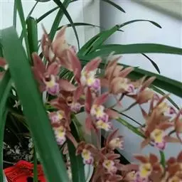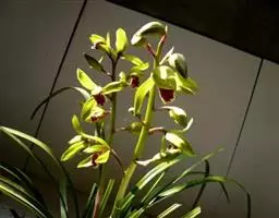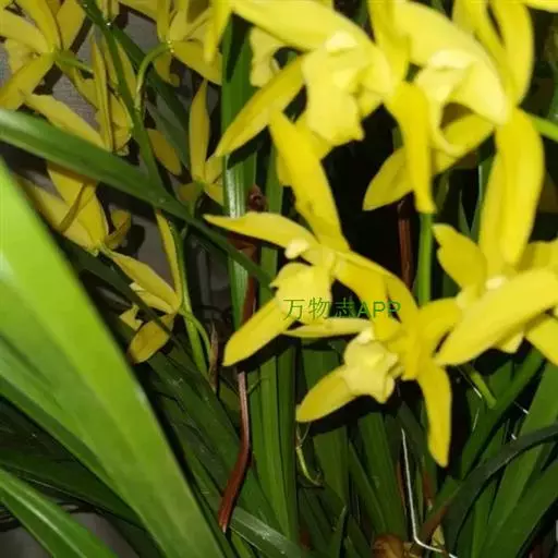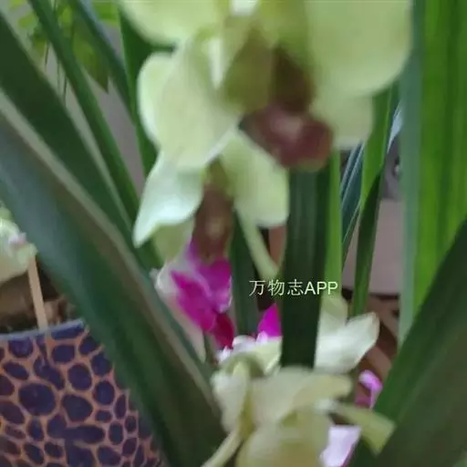 建兰(学名:Cymbidium ensifolium (L. ) Sw.):地生植物;假鳞茎卵球形,包藏于叶基之内。叶2--6枚,带形,有光泽,长30-60厘米,宽1-2.5厘米。花葶从假鳞茎基部发出,直立,一般短于叶;总状花序具3-9朵花;花常有香气,色泽变化较大,通常为浅黄绿色而具紫斑;萼片近狭长圆形或狭椭圆形;花瓣狭椭圆形或狭卵状椭圆形,长1.5-2.4厘米,宽5-8毫米,近平展;唇瓣近卵形,长1.5-2.3厘米,略3裂。蒴果狭椭圆形,长5-6厘米,宽约2厘米。花期通常为6-10月。
