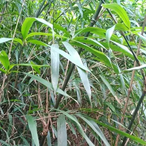 末级小枝具2-5叶;叶鞘革质,光滑无毛,具纵肋,在背部上方近于具脊,外缘生纤毛;鞘口繸毛直立,平滑,易落;叶舌低矮,截形,边缘生细纤毛,背面生有小刺毛;叶片薄纸质,长椭圆状披针形,长8-29厘米,宽1-2.7厘米,先端锐尖,基部收缩为一长约1.8毫米的叶柄,叶片上表面无毛,下表面初被柔毛,后变为无毛,次脉4-7对,再次脉为5-7条。
