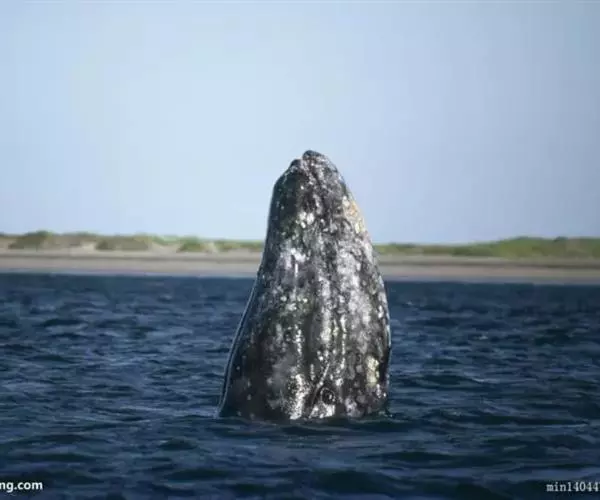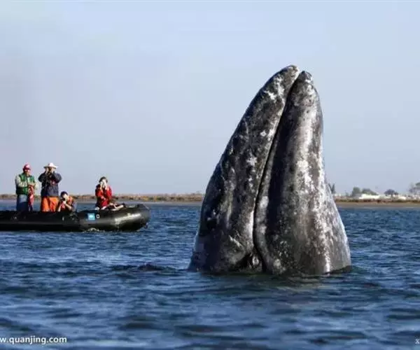 灰鲸体长在10-15米之间,体重达30多吨。全身灰色、暗灰色或蓝灰色,有白色斑点,因此得名,也有人称它是“灰色的岩岸游泳者”,腹面的颜色较淡。身体后部的皮肤上凹凸不平,主要 灰鲸与人的比例 是被岩石或砂擦伤以及藤壶等寄生动物附着后留下的伤疤所形成的赖皮状皮肤。它的眼睛为卵圆形,位于口角的后面,比其他须鲸类的眼睛的位置靠上,上眼睑略长。耳孔较大,可以插入一枝铅笔,位于眼睛与鳍肢的基部之间。鲸须为淡黄色、每侧大约为140-180枚,长度为40-50厘米。须板较厚,须毛粗糙,整个须板给人以沉重的感觉。它头上的毛也较其他须鲸类多,排列不太规则,上、下颌的前端最多,毛的基部不形成瘤状隆起。舌狭而厚,前端灰色,其余部分为粉红色。鳍肢上有4指,缺少第一指。