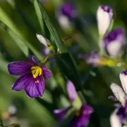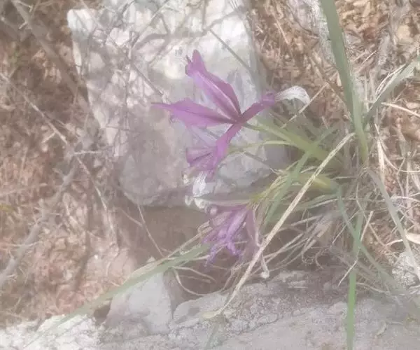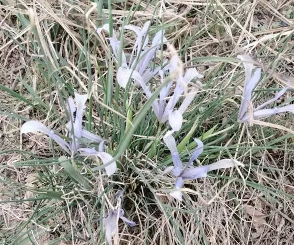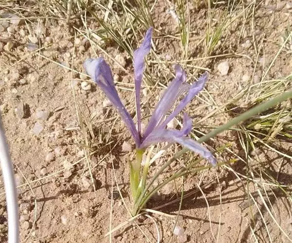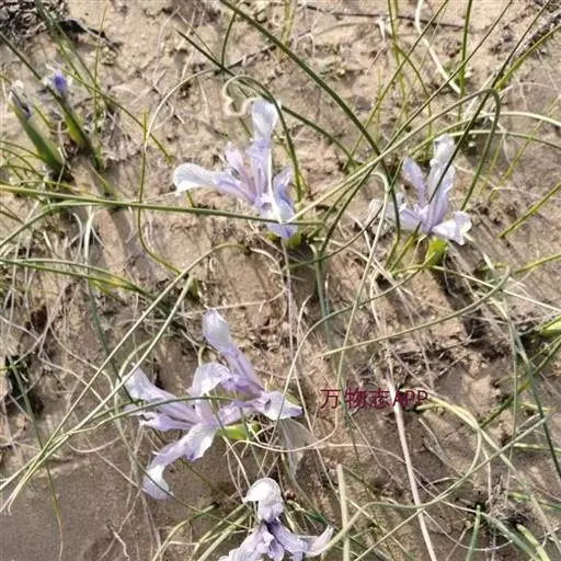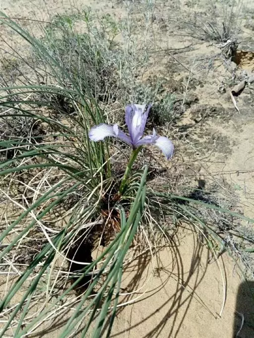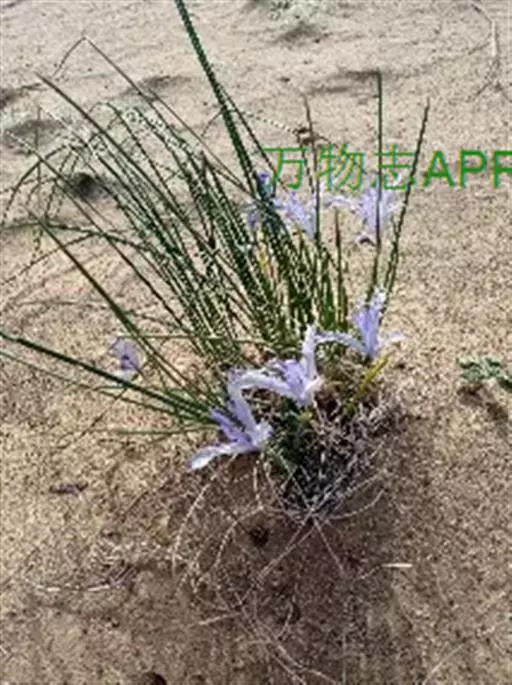 细叶鸢尾(学名:Iris tenuifolia Pall.):多年生密丛草本,植株基部存留有红褐色或黄棕色折断的老叶叶鞘,根状茎块状,短而硬,木质,黑褐色;根坚硬,细长,分枝少。叶质地坚韧,丝状或狭条形。花茎长度随埋砂深度而变化,通常甚短,不伸出地面;苞片4枚,披针形,内包含有2-3朵花;花蓝紫色,直径约7厘米;外花被裂片匙形,爪部较长,内花被裂片倒披针形,直立。蒴果倒卵形,顶端有短喙,成熟时沿室背自上而下开裂。花期4-5月,果期8-9月。