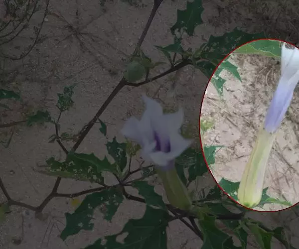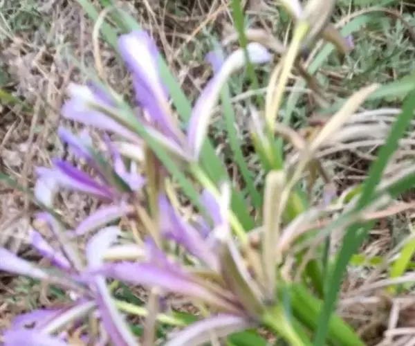 花茎长度随埋砂深度而变化,通常甚短,不伸出地面;苞片4枚,披针形,长5-10厘米,宽8-10毫米,顶端长渐尖或尾状尖,边缘膜质,中肋明显,内包含有2-3朵花;花蓝紫色,直径约7厘米;花梗细,长3-4毫米;花被管长4.5-6厘米,外花被裂片匙形,长4.5-5厘米,宽约1.5厘米,爪部较长,中央下陷呈沟状,中脉上无附属物,但常生有纤毛,内花被裂片倒披针形,长约 5厘米,宽约5毫米,直立;雄蕊长约3厘米,花丝与花药近等长;花柱分枝长约4厘米,宽约4-5毫米,顶端裂片狭三角形,子房细圆柱形,长0.7-1.2厘米,直径约2毫米。