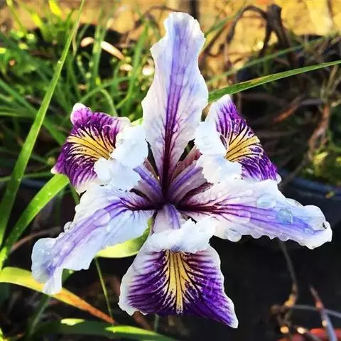细叶鸢尾是多年生密丛草本植物,植株基部存留有红褐色或黄棕色折断的老叶叶鞘,根状茎块状,短而硬,木质,黑褐色;根坚硬,细长,分枝少。叶质地坚韧,丝状或狭条形,长20-60厘米,宽1.5-2毫米,扭曲,无明显的中脉。