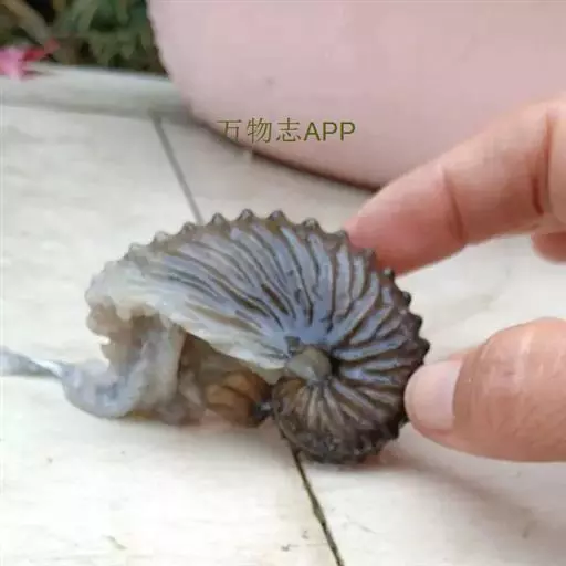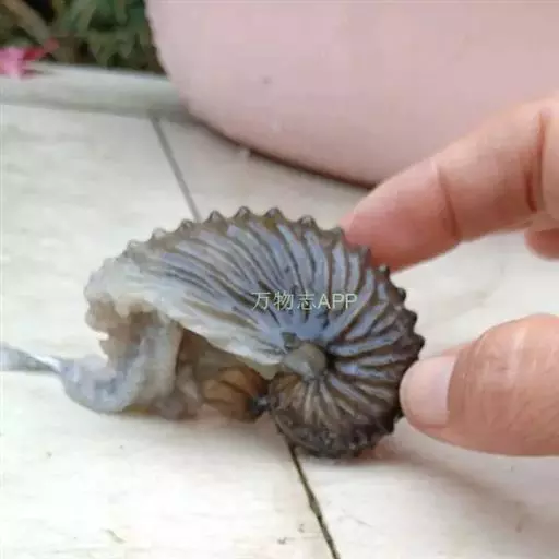 螺壳构造 其外壳呈螺旋形,贝壳弯曲,在平面上作背缘旋转,呈圆盘形。贝壳左右对称。壳面光滑,呈灰白色,具有多条红褐色的火焰条状斑纹,生长纹细密。内部表面为珍珠层,被分隔成许多独立的小房间(解剖发现最多的有38个隔断),各隔断之间有一根体管相连通,通过控制房间内的气体排放来完成身体在水中的升降,最外边的一间是最大的,用于存放鹦鹉螺的身体。鹦鹉螺有90只腕手,无吸盘,为叶状或丝状的触手,用于捕食及爬行,其中有两个合在一起变得很肥厚,当肉体缩到贝壳里的时候,用它盖住壳口,这与腹足类的厣的作用相当,在休息时,总会有几条触手负责警戒。在所有触手的下方,有一个类似鼓风夹子的漏斗状结构,通过肌肉收缩向外排水,以推动鹦鹉螺的身体向后移动。