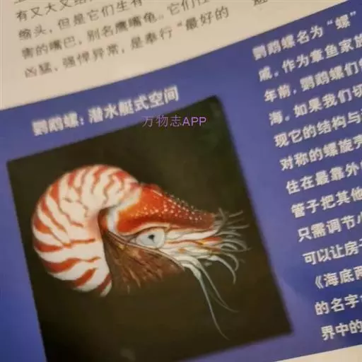 鹦鹉螺有螺旋状外壳的软体动物,是现代章鱼、乌贼类的亲戚。鹦鹉螺的贝壳很美丽,构造也颇具特色,这种石灰质的外壳大而厚,左右对称,沿一个平面作背腹旋转,呈螺旋形。贝壳外表光滑,灰白色,后方间杂着许多橙红色的波纹状,壳有两层物质组成,外层是磁质层,内层是富有光泽的珍珠层。被截剖的鹦鹉螺,像是旋转的楼梯,又像一条百褶裙,一个个隔间由小到大顺势旋开,它决定了鹦鹉螺的沉浮,这正是开启潜艇构想的钥匙,世界上第一艘蓄电池潜艇和第一艘核潜艇因此被命名为“鹦鹉螺号”。