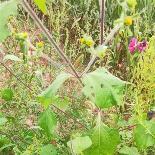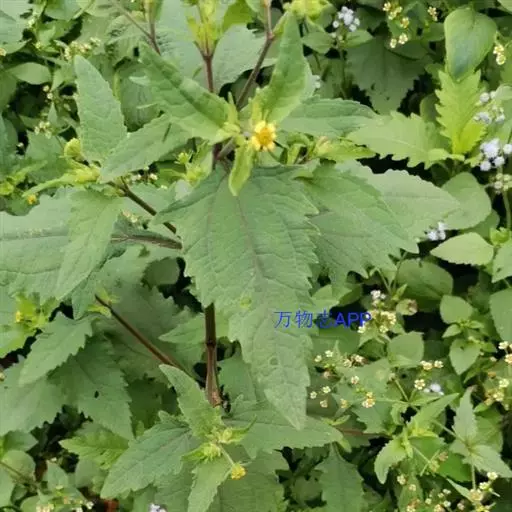 2、腺梗豨莶又名:毛豨莶。一年生草本。茎直立,粗壮,高30-110厘米,上部多分枝,被开展的灰白色长柔毛和糙毛。基部叶卵状披针形,花期枯萎;中部叶卵圆形或卵形,开展,长3.5-12厘米,宽1.8-6厘米,基部宽楔形,下延成具翼而长1-3厘米的柄,先端渐尖,边缘有尖头状规则或不规则的粗齿;上部叶渐小,披针形或卵状披针形;全部叶上面深绿色,下面淡绿色,基出三脉,侧脉和网脉明显,两面被平伏短柔毛,沿脉有长柔毛。头状花序径约18-22毫米,多数生于枝端,排列成松散的圆锥花序;花梗较长,密生紫褐色头状具柄腺毛和长柔毛;总苞宽钟状;总苞片2层,叶质,背面密生紫褐色头状具柄腺毛,外层线状匙形或宽线形,长7-14毫米,内层卵状长圆形,长3.5毫米。舌状花花冠管部长1-1.2毫米,舌片先端2-3齿裂,有时5齿裂;两性管状花长约2.5毫米,冠檐钟状,先端4-5裂。瘦果倒卵圆形,4棱,顶端有灰褐色环状突起。花期5-8月,果期6-10月。