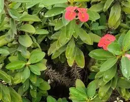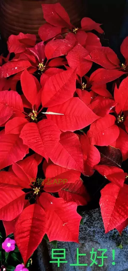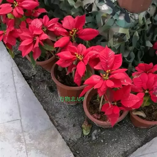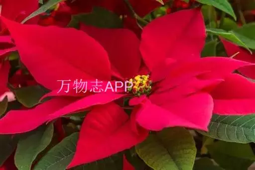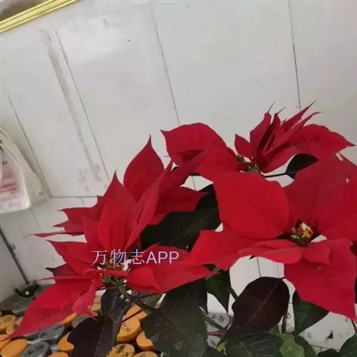 一品红为常绿灌木。茎直立,含乳汁。叶互生,卵状椭圆形,下部叶为绿色,上部叶苞片状,红色。花序顶生。常见品种有