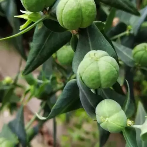 蒴果,三棱状圆形,长1.5-2.0 厘米,直径约1.5厘米,平滑无毛。种子卵状,长约1厘米,直径8-9毫米,灰色或淡灰色,近平滑;无种阜。花果期10月至次年4月。