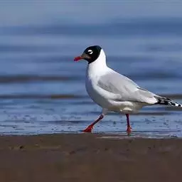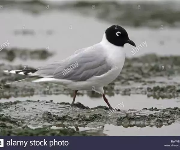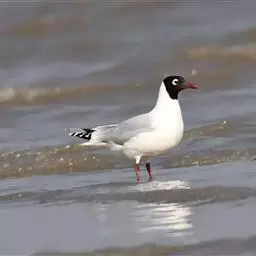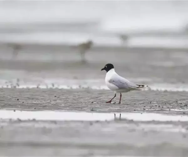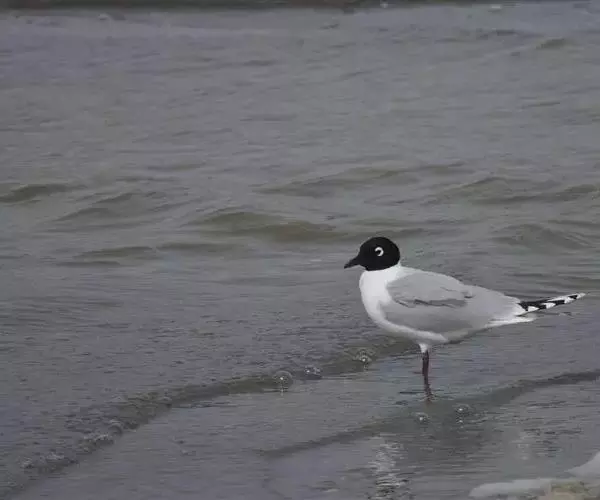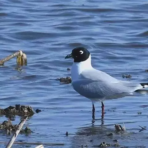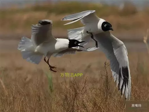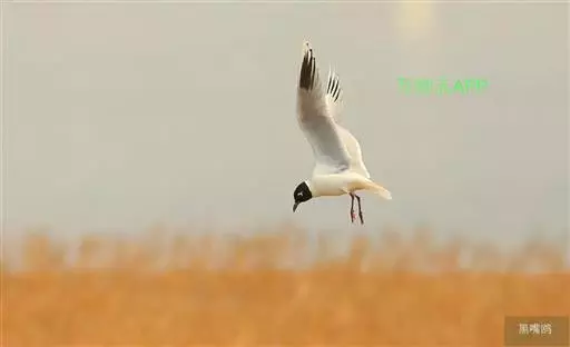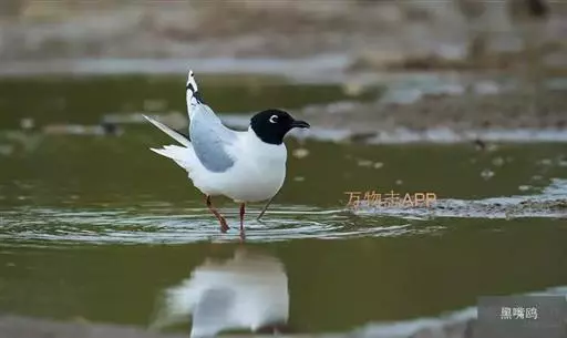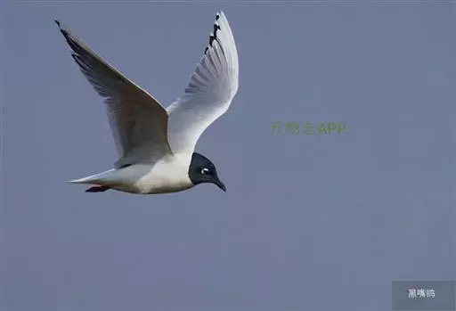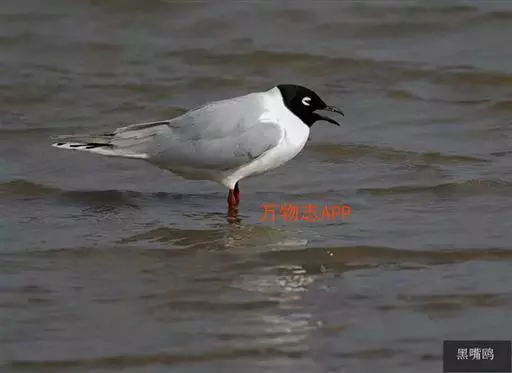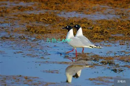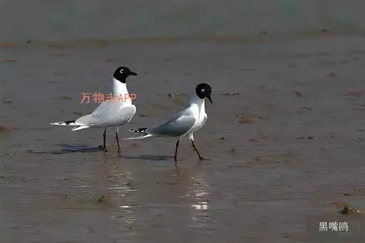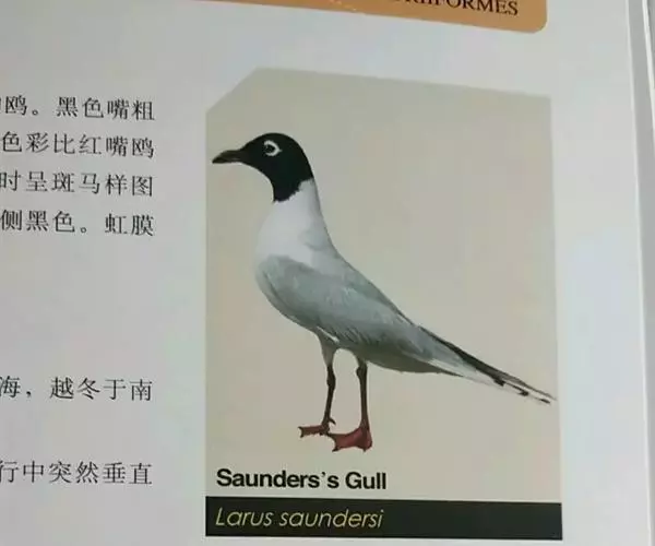 黑嘴鸥 (学名:Larus saundersi)中型水鸟,体长31~39厘米。嘴黑色,脚红色。夏羽头黑色,眼上和眼 下具白色星月形斑,在黑色的头上极为醒目。颈、腰、尾上覆羽、尾和下体白色。初级飞羽末端具黑色斑点。翼下仅部分初级飞羽黑色,与整个翼下表面和下体白色形成鲜明对比。飞翔时甚为醒目。冬羽和夏羽相似,但头白色,头顶有淡褐色斑,耳区有黑色斑点。