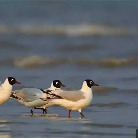 鸥嘴噪鸥,中型水禽,体长31~39厘米。夏羽额、头顶、枕和头的两侧从眼和耳羽以上黑色。背、肩、腰和…