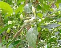 夜来香是柔弱藤状灌木;小枝被柔毛,黄绿色,老枝灰褐色,渐无毛,略具有皮孔。叶膜质,卵状长圆形至宽卵形,长6.5-9.5厘米,宽4-8厘米,顶端短渐尖,基部心形;叶脉上被微毛;基脉3-5条,侧脉每边约6条,小脉网状;叶柄长1.5-5厘米,被微毛或脱落,顶端具丛生3-5个小腺体。