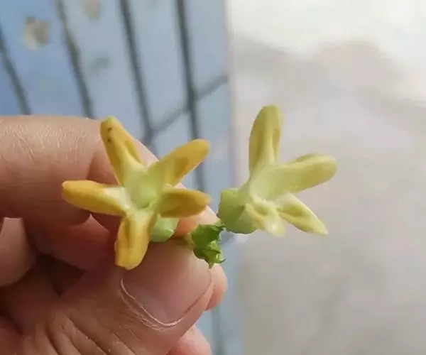 伞形状聚伞花序腋生,着花多达30朵;花序梗长5-15毫米,被微毛,花梗长1-1.5厘米,被微毛;花芳香,夜间更盛;花萼裂片长圆状披针形,外面被微毛,花萼内面基部具有5个小腺体;花冠黄绿色,高脚碟状,花冠筒圆筒形,喉部被长柔毛,裂片长圆形,长6毫米,宽3毫米,具缘毛,干时不折皱,向右覆盖;副花冠5片,膜质,着生于合蕊冠上,腹部与花药粘生,下部卵形,顶端舌状渐尖,背部凸起有凹刻;花药顶端具内弯的膜片;花粉块长圆形,直立;子房无毛,心皮离生,每室有胚珠多个,花柱短柱状,柱头头状,基部五棱。