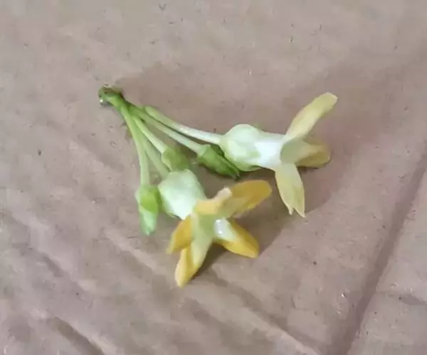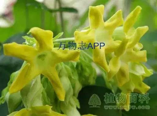 夜来香(学名:Telosma cordata (Burm. f.) Merr.): 柔弱藤状灌木;小枝被柔毛,黄绿色,老枝灰褐色,渐无毛,略具有皮孔。叶膜质,卵状长圆形至宽卵形,叶脉上被微毛。伞形状聚伞花序腋生,着花多达30朵;花芳香,夜间更盛;花冠黄绿色,高脚碟状,花冠筒圆筒形,喉部被长柔毛,裂片长圆形,具缘毛,干时不折皱,向右覆盖;副花冠5片,膜质,着生于合蕊冠上,花柱短柱状,柱头头状,基部五棱。蓇葖披针形,外果皮厚,无毛;种子宽卵形,顶端具白色绢质种毛。花期5-8月,极少结果。