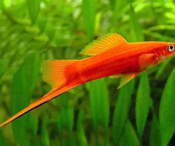 小型鱼,成年个体全长7~10cm,体纺锤形、头尖尾长。红剑鱼遍体通红,是水草缸中的调色者,俗话说的“万绿丛中一点红”,正是它的写照。另外,雄性携长剑、雌性着圆裙(圆形尾),性别特征分明,也是其它鱼类少见的。