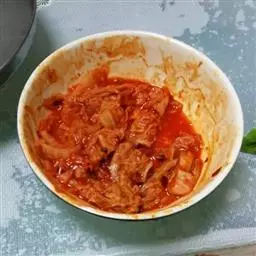3.将辣豆瓣酱、白醋、蒜末、芝麻香油、白砂糖、广东米酒、凉开水150ml混合,搅拌均匀,制成腌酱待用。