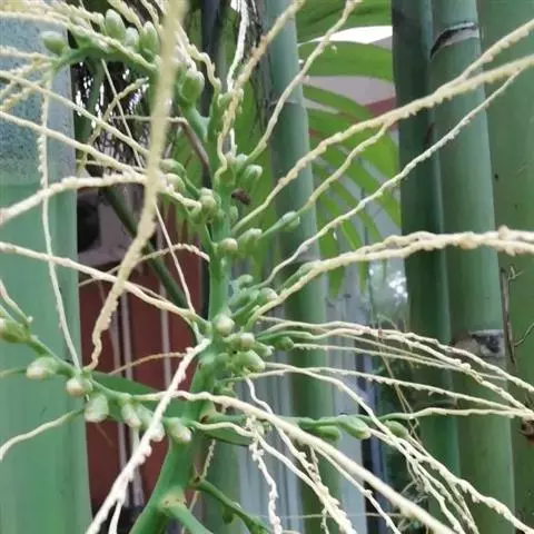 花序大型,弓状下垂,长于叶(长3.6米),从管状的一级佛焰苞内抽出几个大的分枝花序,每个分枝花序由几个迭生的长40-50厘米的柏木形的小分枝花序组成,小分枝花序上又着生许多丝状的长6-8厘米的小花枝;花蕾披针形渐尖;花萼管状钟形,基部截平,裂片3,约裂至中部,阔卵形,具小圆齿,顶端稍被锈色鳞秕;花冠2倍长于花萼,下部1/5为管状,裂片披针形渐尖,略具芒尖;与花冠裂片对生的雄蕊粗纺锤形,与花冠裂片互生的雄蕊圆柱形,钻状,较细,花药披针状箭头形,急尖,顶端短2裂;子房小,陀螺形,3裂,上部骤缩成一个丝状的花柱,柱头具细点,不分裂。果实卵球形,长约9.5毫米,直径约6毫米,亮黑色,顶端具刚毛状的长5-6毫米的宿存花柱。种子卵形,两端圆,长约7毫米,直径约5毫米,胚乳均匀,胚基生。花期7月。