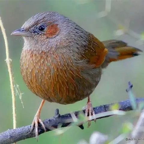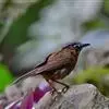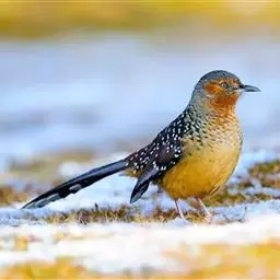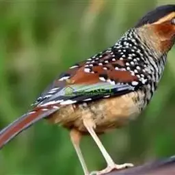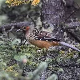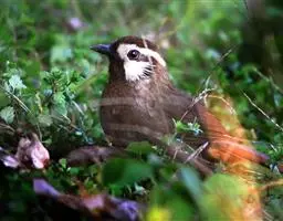 大噪鹛:中型鸟类,体长32-36厘米。额至头顶黑褐色,背栗褐色满杂以白色斑点,…
