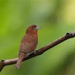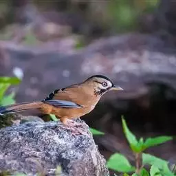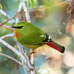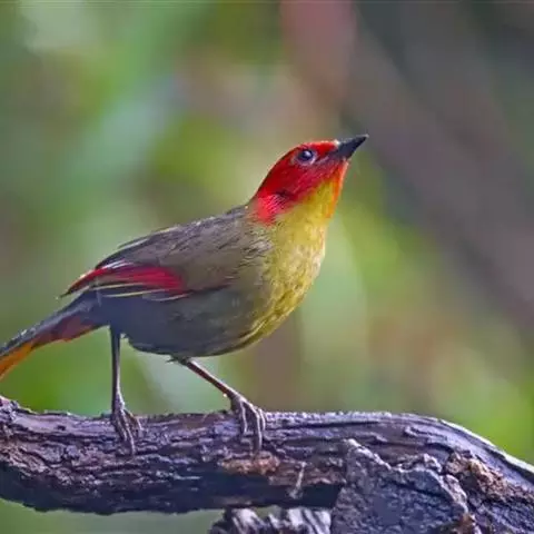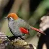 赤尾噪鹛中型鸟类,体长24~28厘米。头顶至后颈红棕色,两翅和尾鲜红色,眼先、眉纹、颊、颏和喉黑色,…