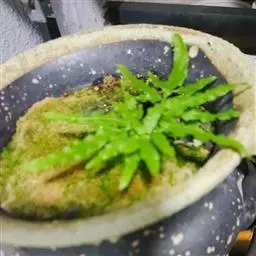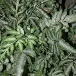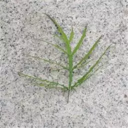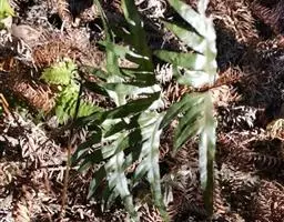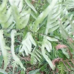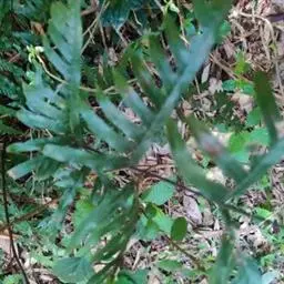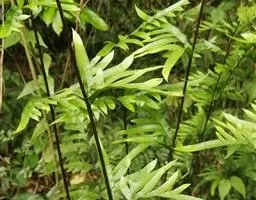 叶密生,二型;柄长10-30厘米(不育叶的柄较短),粗1.5-2毫米,与叶轴同为禾秆色,稍光泽,光滑;叶片长圆状卵形,长10-25厘米(不育叶远比能育叶短),宽5-15厘米羽状,羽片3-6对,对生,稍斜向上,上部的无柄,下部的有短柄;不育叶的下部羽片相距1.5-2(3)厘米,三角形,尖头,长2.5-3.5(8)厘米,宽1.5-2.5(4)厘米,常为羽状,小羽片2-3对,对生,密接,无柄,斜展,长圆状倒卵形至阔披针形,先端钝圆,基部下侧下延下部全缘,上部及先端有尖齿;能育叶的羽片疏离(下部的相距5-7厘米),通常为2-3叉,中央的分叉最长,顶生羽片基部不下延,下部两对羽片有时为羽状,小羽片2-3对,向上,狭线形,先端渐尖,基部下侧下延,先端不育的叶缘有密尖齿,余均全缘主脉禾秆色,下面隆起;侧脉密接,通常分叉。叶干后草质,灰绿色至褐绿色,无毛。 [2-3]