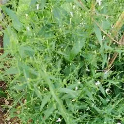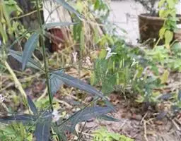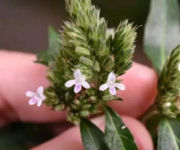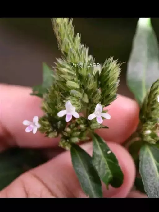 灌木状草本或直立亚灌木,高45厘米或过之。茎纤细,4棱,有极狭的翅,近光滑或被极疏的微毛。叶矩圆状卵形或卵形,连柄长8-10厘米,宽2-2.5厘米,顶端长渐尖,钝,基部渐狭,下延至柄,具0.5-2厘米的柄,边缘具圆齿或浅波状,草质,上面被疏毛,暗棕色,背面灰白色,主脉上被黄褐色柔毛,中肋和侧脉微隆起,侧脉每边4条,近边缘网结。穗状花序顶生或腋生,无梗,单个或3-5个集合,矩圆状卵形。花密集,偏向一侧,苞片披针形,外面被刚毛,长5-6毫米,覆瓦状排列。花萼长6毫米,不等5深裂,外面有髯毛,裂片披针形,长渐尖,有长芒,具1中肋,有黄色边,下方的最宽,两侧最狭,上侧最长。花冠长8-9毫米,冠管钟形,外面被极短反折微柔毛,冠管长3.5毫米,顶端稍收缩,喉里面基部有反折的髯毛,冠檐裂片4,长圆形,顶端圆,下方裂片最宽,顶端短而钝,2齿或全缘。子房卵形被刚毛,花柱极少刚毛,柱头矩圆状头形。花盘环形,稍5裂。