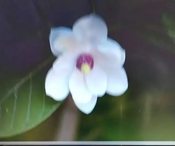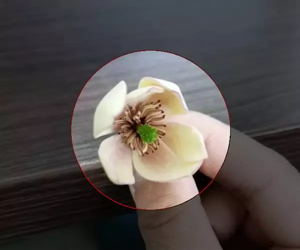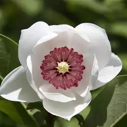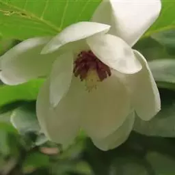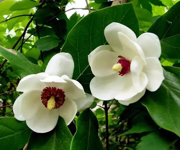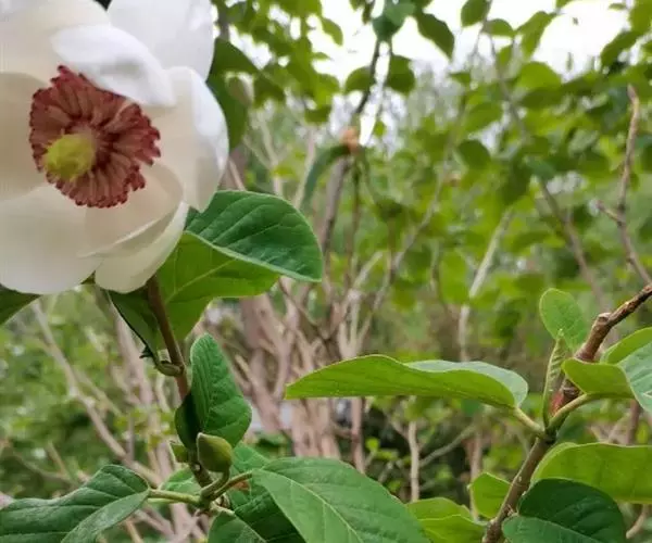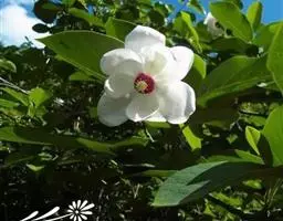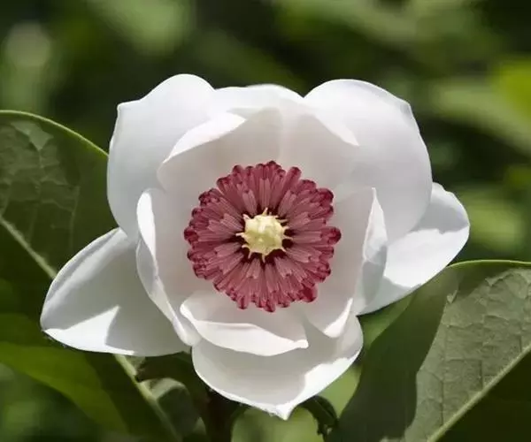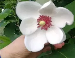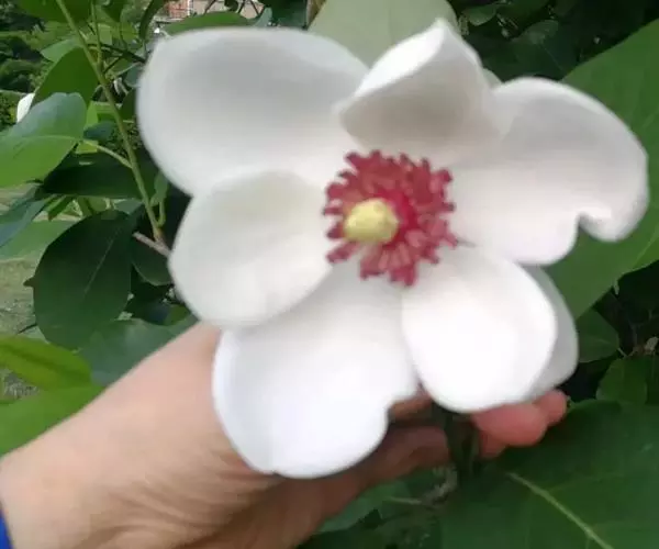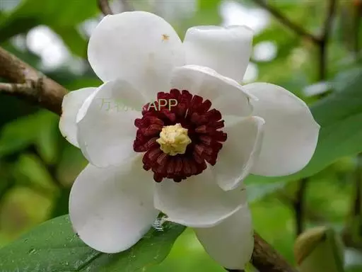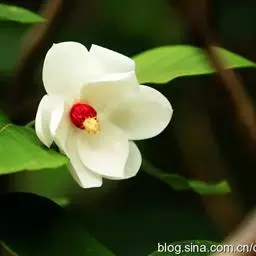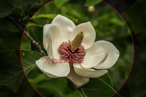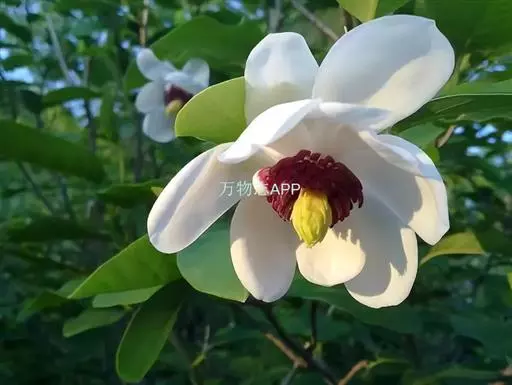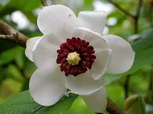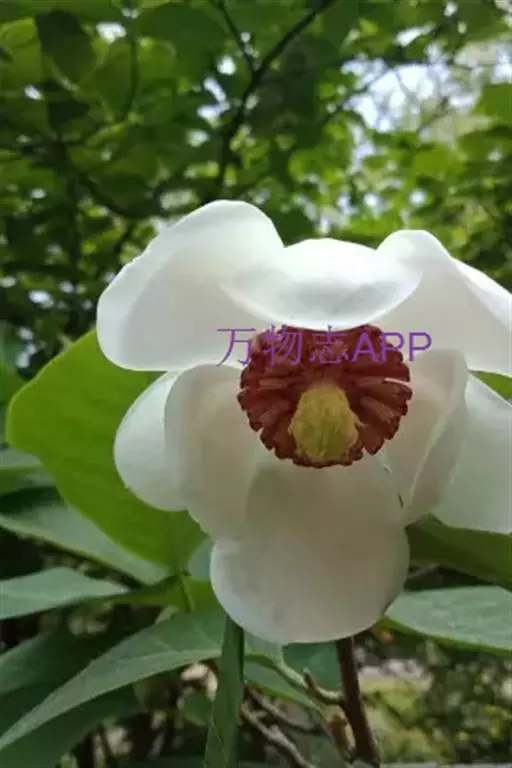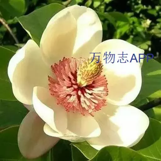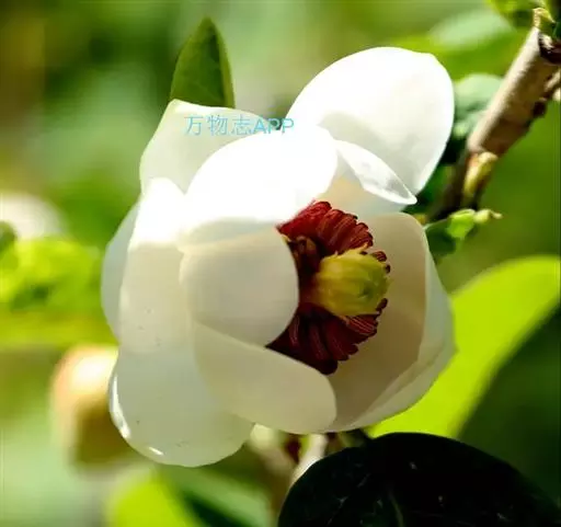 花与叶同时开放,白色,芳香,杯状,盛开时碟状,直径7-10厘米;花梗长3-7厘米,密被褐色及灰白色平伏长柔毛,着生平展或稍垂的花朵;花被片9,近等大,外轮3片长圆状倒卵形或倒卵形,长4-6厘米,宽2.5-3.5厘米,基部被白色毛,顶端宽圆或圆,内两轮6片,较狭小,基部渐狭成短爪;雄蕊紫红色,长9-11毫米,花药长约6毫米,两药室邻接,内向纵裂,顶端微凹或药隔平,不伸出,花丝长3-4毫米;雌蕊群椭圆形,绿色,长约1.5厘米。聚合果熟时红色,倒卵圆形或长圆体形,长2-7厘米;蓇葖狭椭圆体形,长约1厘米,沿背缝线二瓣全裂。顶端具长约2毫米的喙;种子心形,假种皮橘红色,外种皮深褐色,长与宽6-7毫米,顶孔细小末端具尖。