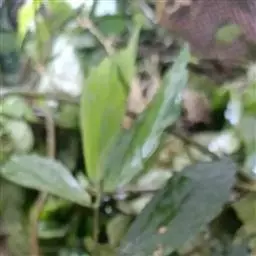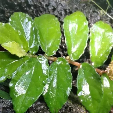 性状鉴别 干品多缠绕扭曲。茎细长,暗紫色,节处可见纤细的不定根或合生的小托叶。叶有两种,一种细小线形,一种较大,湿润展平后呈斜卵形,长2-6cm,宽1-3cm,先端钝圆,基部极不对称,边缘有波状圆锯齿,表面深绿色,可见明显而稠密的线状条纹(钟乳体),尤以边缘处更密集,质脆。气微,味微甘、涩。