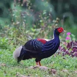 蓝鹇是雉科、鹇属一种大型雉类。体长50-80厘米。雄鸟头颈黑色,羽冠白色,有时杂以黑斑;脸红色,…
