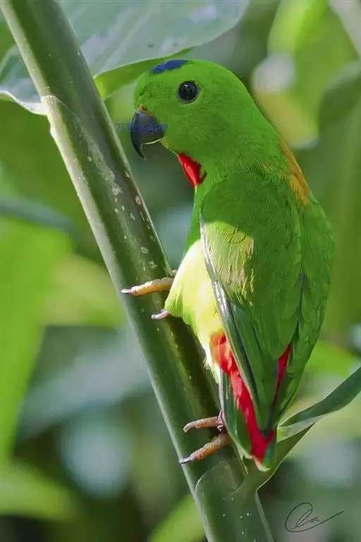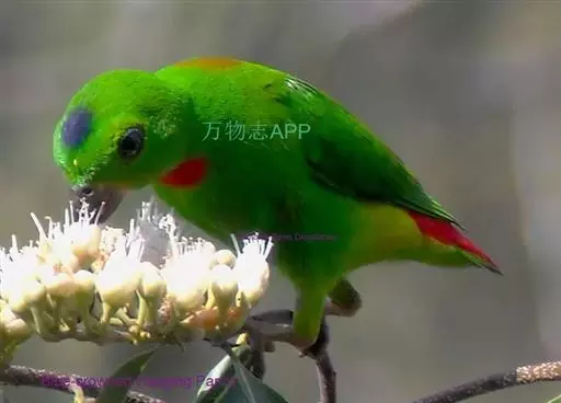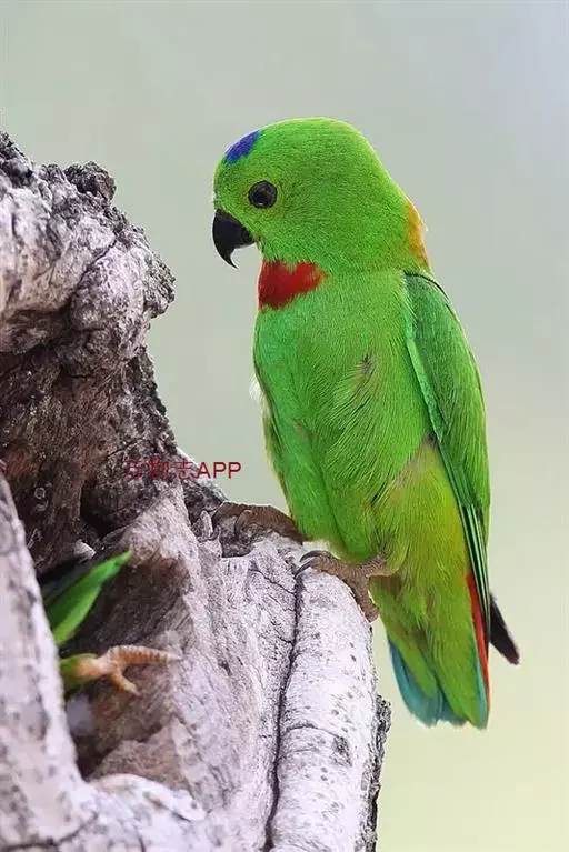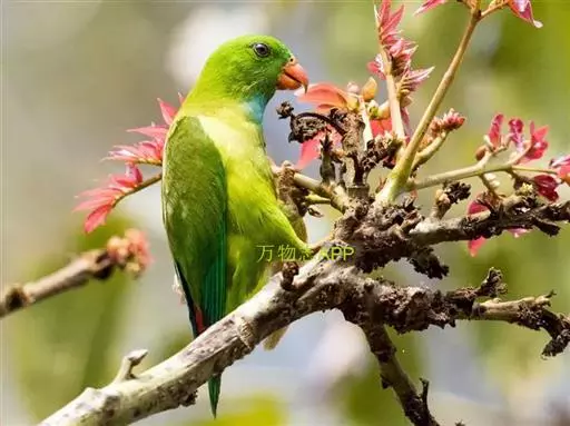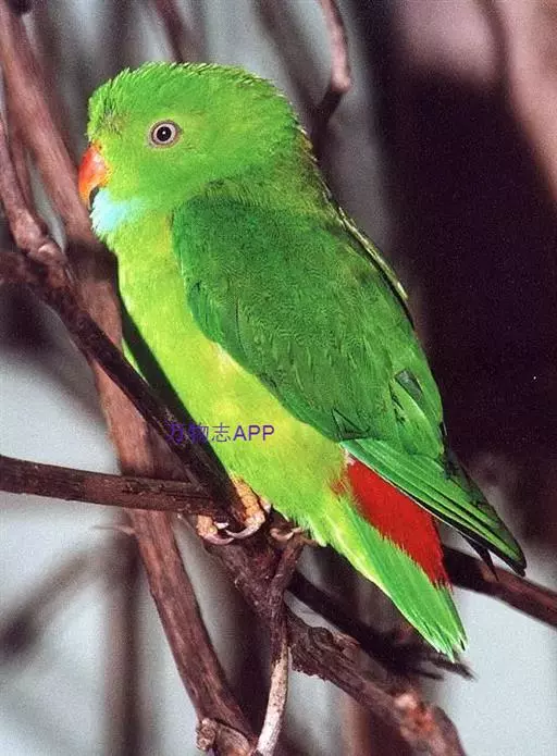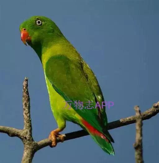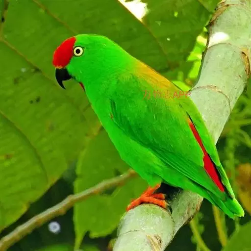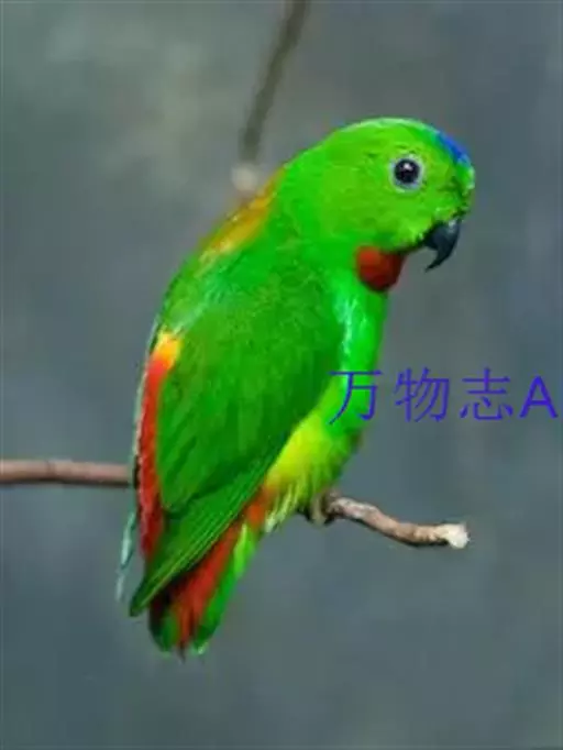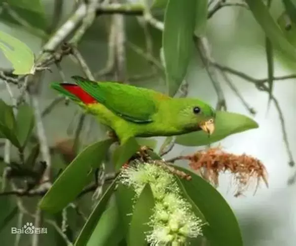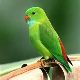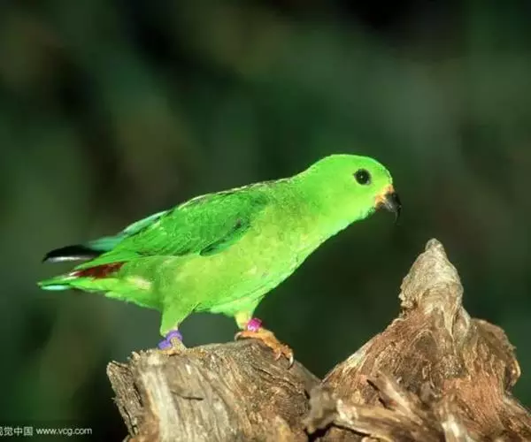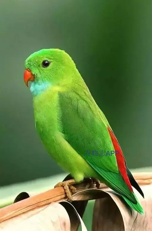 短尾鹦鹉(学名:Loriculus vernalis)是典型的攀禽,体形小,翅长在90毫米左右;尾较翅短;嘴较细削,其厚度不及嘴峰长度;腰下有朱红色块斑;雄鸟喉部有蓝色块斑。鸟喙强劲有力,喙钩曲,上颌具有可活动关节,喙基部具有腊膜。肌肉质舌厚。脚短,强劲有力,对趾型,两趾向前两趾向后,适合抓握和攀援生活。体羽主要是绿色,红嘴红腰,翼下为青绿色带绿色翼衬。