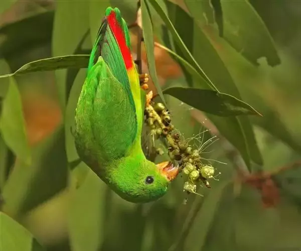 喜集成小群活动。主要以植物和开花灌木、果实、花蜜、水果,比如无花果、梨、苹果、香蕉和蔬菜种子等为食。因为这种鹦鹉常喜欢悬挂在树枝上休息和嬉戏,所以也称悬挂鹦鹉或悬吊鹦鹉。这是一种安静的小鹦鹉,大多可在晚上听到充满旋律的鸣叫声。