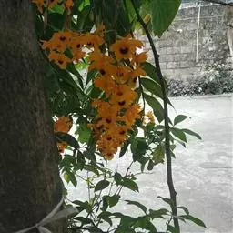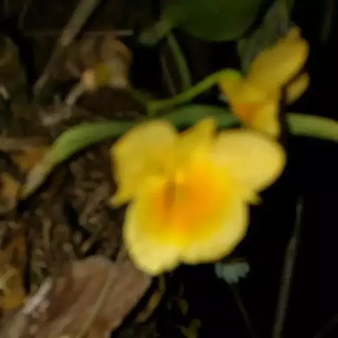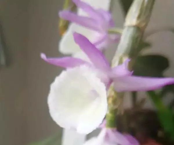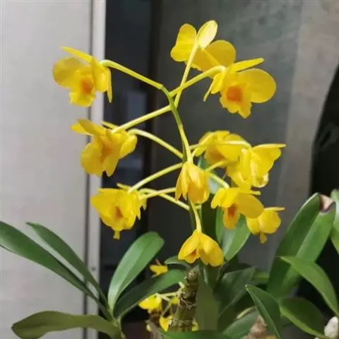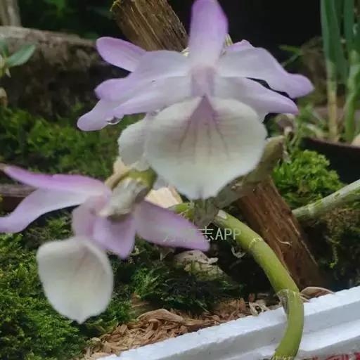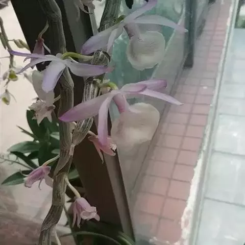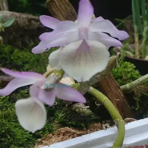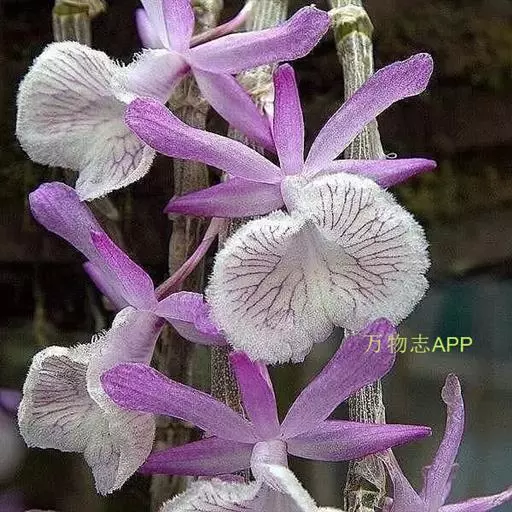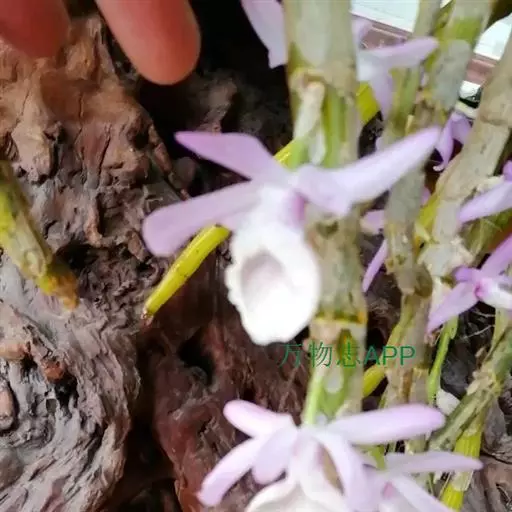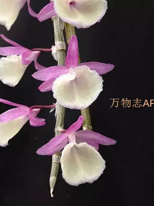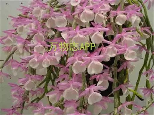 报春石斛(学名:Dendrobium primulinum Lindl. ):茎下垂,厚肉质,圆柱形,不分枝,具多数节,节间长2-2.5厘米。叶纸质,二列,互生于整个茎上,披针形或卵状披针形,基部具纸质或膜质的叶鞘。总状花序具1-3朵花,通常从落了叶的老茎上部节上发出;花开展,下垂,萼片和花瓣淡玫瑰色;花瓣狭长圆形,长3厘米,宽7-9厘米,先端钝,具3-5条脉,全缘;唇瓣淡黄色带淡玫瑰色先端,宽倒卵形,两面密布短柔毛,边缘具不整齐的细齿,唇盘具紫红色的脉纹。花期3-4月。