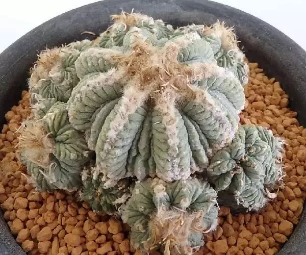 年幼植株的颜色为淡草绿色中透着苍白,老年植株更加趋向灰绿色。人工栽培条件下,花笼幼嫩的部分,呈现出紫红色,这种情况在嫁接株上表现更加明显。花笼球体的棱脊和顶部长着早落而卷曲的土黄色小刺1~3根以及微小的绒毛,这些绒毛沿着棱脊的中心线生长,而副棱脊上则不长绒毛。