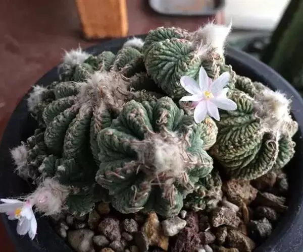 花小, 直径不超过1cm,白色稍带粉红,外围花瓣色较深,通常嫁接花笼开出的花色更加泛红,花瓣的外周通常缀有略深的条纹。花朵从球顶部的绒毛中开出,有六个萼瓣同时开放。花朵的管束很长,呈高脚杯状,花朵具有轻微的香气,种子细小。野生花笼的种子通常通过风进行传播。 花笼的变异品种主要有花笼锦,花笼缀化,分割棱的花笼等。非常少见。