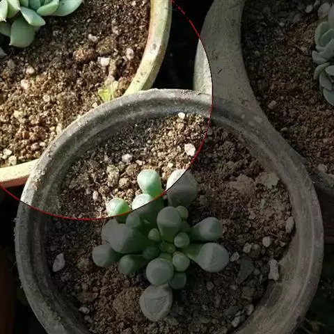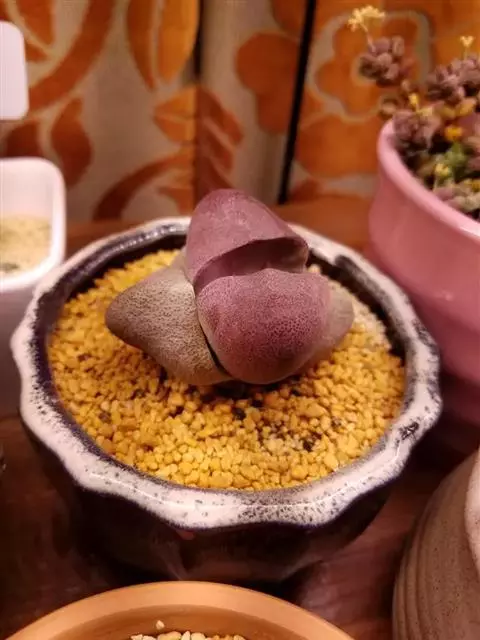 荒玉为番杏科生石花属,原产南非。株体呈白粉色,表面布满凹凸纹路,凹陷处为红褐色,每年秋季开黄花。