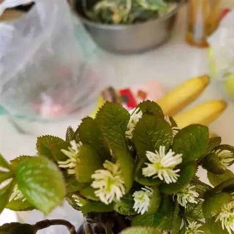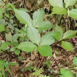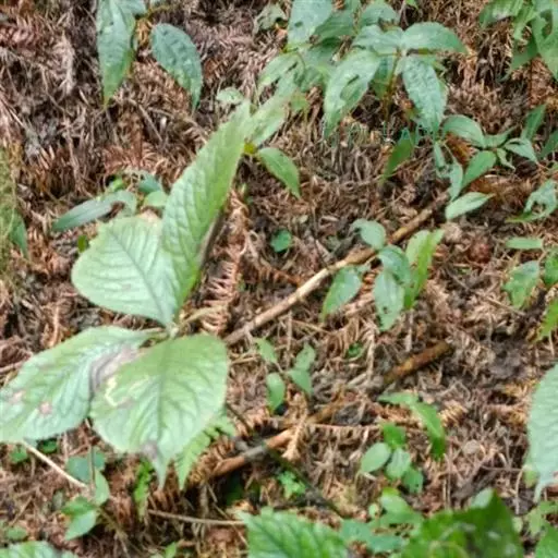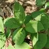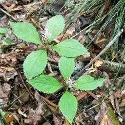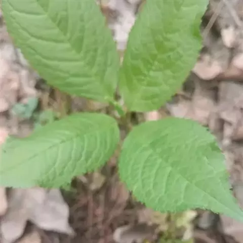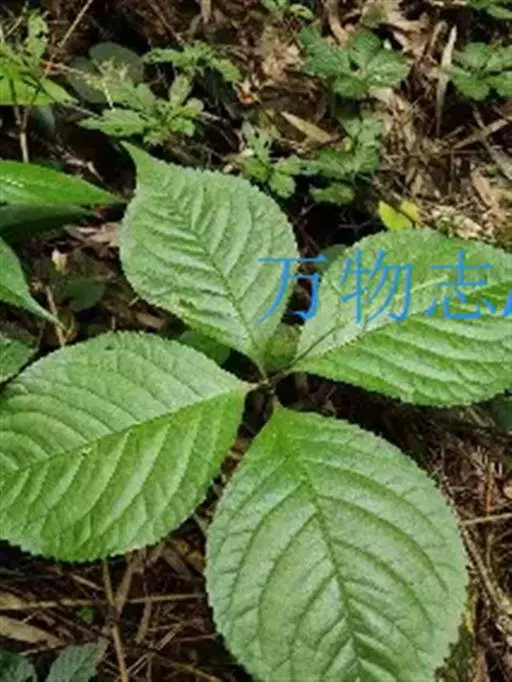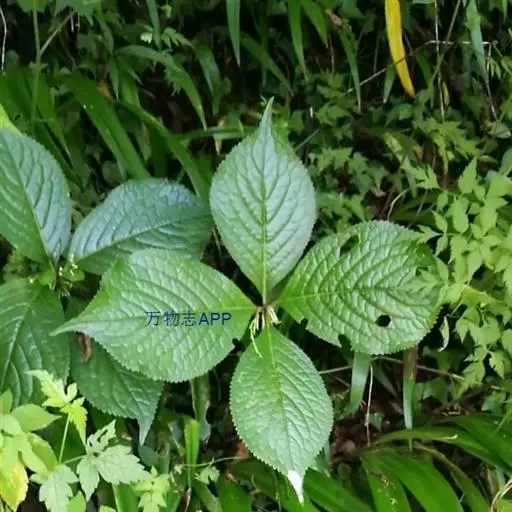 叶对生,通常4片生于茎上部,纸质,宽椭圆形、卵状椭圆形或倒卵形,长9-18厘米,宽5-9厘米,顶端渐尖,基部楔形至宽楔形,边缘具锯齿,齿端有一腺体,背面中脉、侧脉有鳞屑状毛;叶脉6-8对;叶柄长0.5-1.2厘米;鳞状叶卵状三角形,膜质。托叶小,钻形。